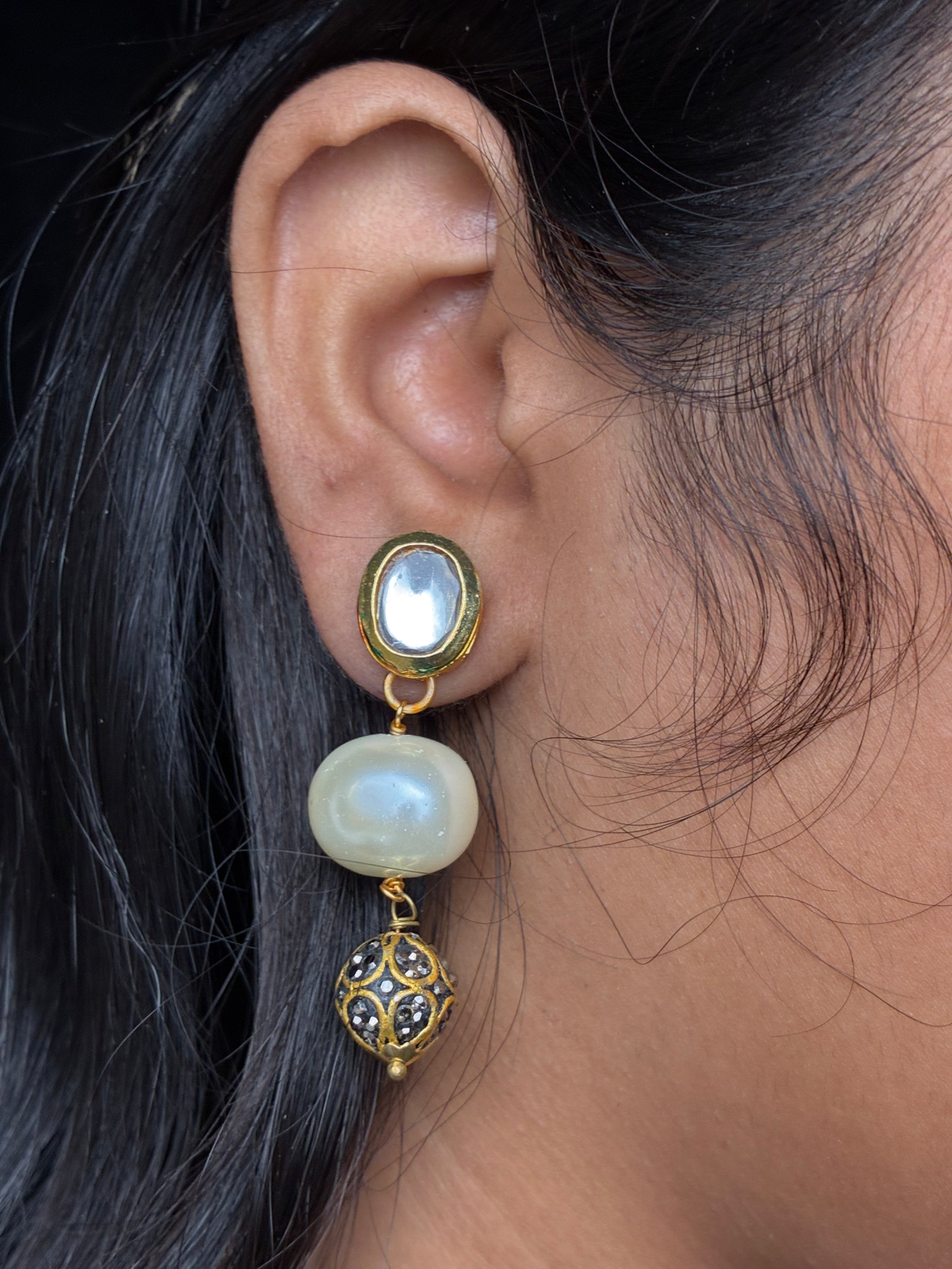 Elevate your style with these stunning imitation dangle earrings from Reva Jewellery! Featuring a gold-tone finish, an oval faux gemstone, a pearl-like bead, and intricate detailing, these earrings blend traditional charm with modern flair. Lightweight and affordable, they’re perfect for any occasion.