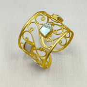 Website Caption: Make a royal statement with this ornate gold-tone cuff, featuring swirling filigree patterns and natural baroque pearls. A unique piece for the bold and artistic soul.