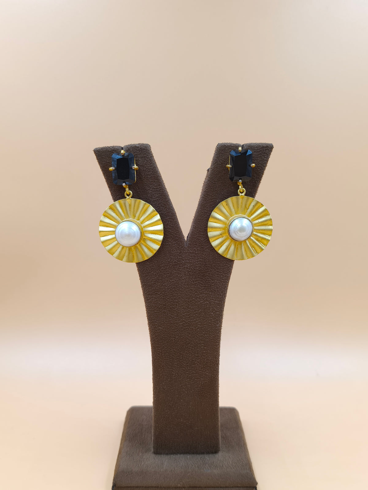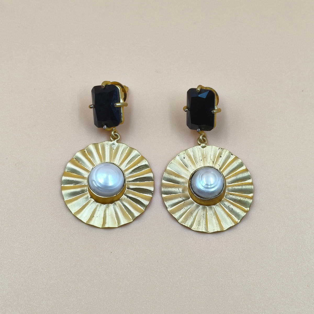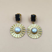 Inspired by the balance of light and dark, the Midnight Sun Drops blend earthy textures with cosmic energy. A hammered gold-tone circle radiates warmth around a soft pearl centerpiece, anchored by a bold black gem that adds a mysterious edge. These earrings bring artful flair to both boho looks and modern ensembles.