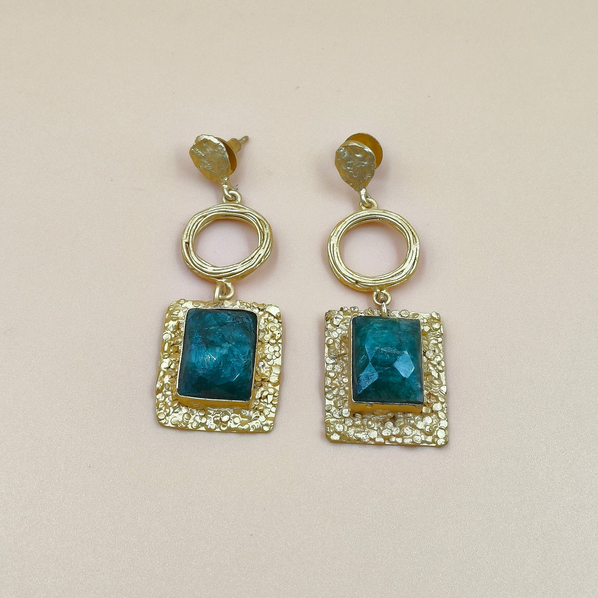 Make a regal statement with these stunning drop earrings. Featuring deep teal stones set in textured gold rectangular frames, these earrings are a perfect harmony of elegance and bold design. Lightweight and striking — ideal for elevating any look, day or night.