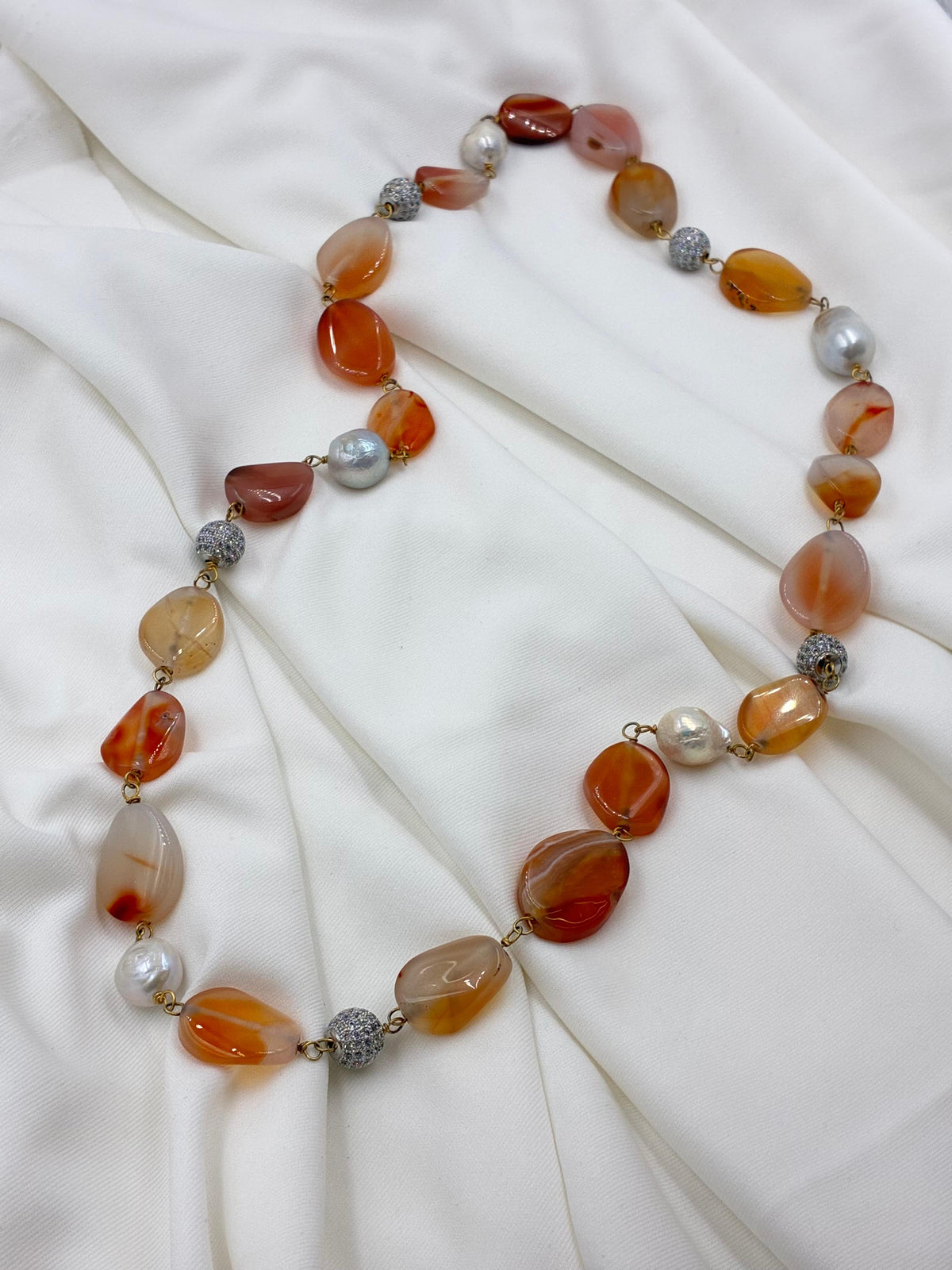 It captures the warm, glowing hues of the stones and the soft elegance of the pearls—perfectly reflecting the natural yet luxurious feel of the piece.
