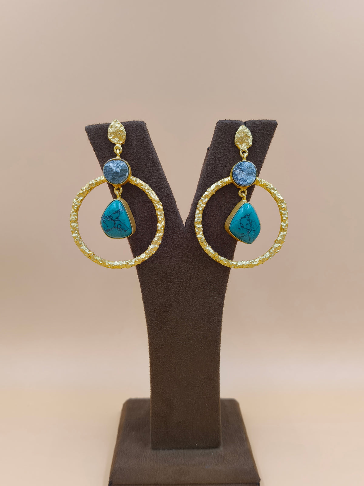 Where modern artistry meets timeless elegance — textured golden hoops crowned with serene turquoise gems for a statement that never fades.”