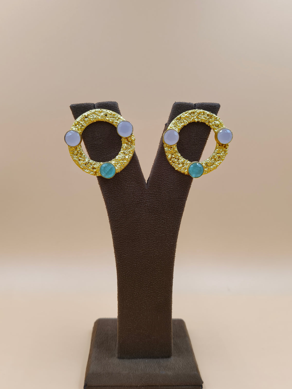 Elevate your look with these Radiant Circle Earrings. Featuring a textured gold-tone hoop adorned with soothing lavender and vibrant teal stones, these earrings offer a perfect blend of elegance and color. Lightweight and versatile, they effortlessly enhance both casual and formal outfits.