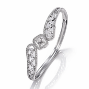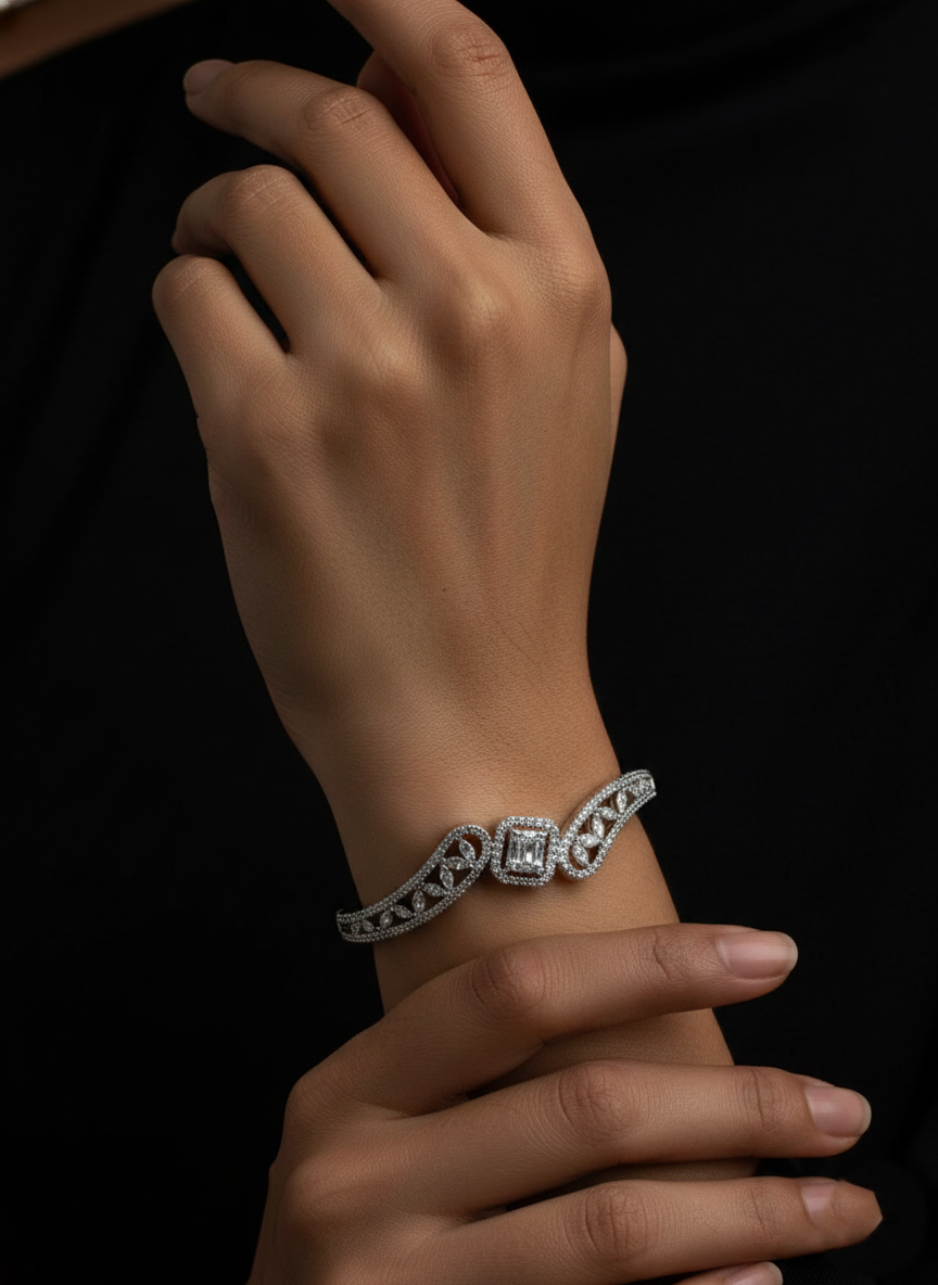 Crafted in a sleek silver finish, this bracelet features an intricate openwork vine pattern adorned with shimmering crystals that catch the light from every angle. At its heart lies a striking geometric centerpiece—a radiant square-cut crystal framed with delicate micro-stones, adding depth and dimension to the design.